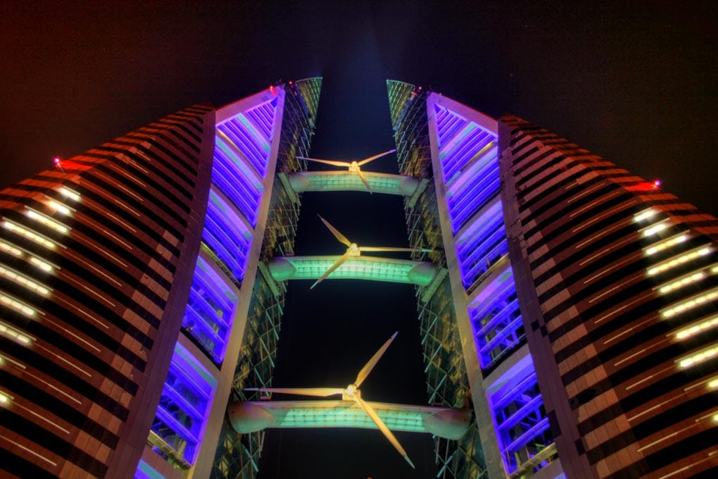 Bahrain World Trade Centre ma własne turbiny wiatrowe zamontowane w prześwicie pomiędzy dwoma skrzydłami budynku, które mają kształt żagli, dziek czemu chwytają wiatr na potrzeby turbin zawieszonych miedzy nimi.